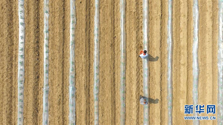 5月19日,在山東省聊城市茌平縣肖莊鎮(zhèn)田莊村,村民在田間播種花生(無人機拍攝)。 新華社發(fā)(趙玉國 攝)