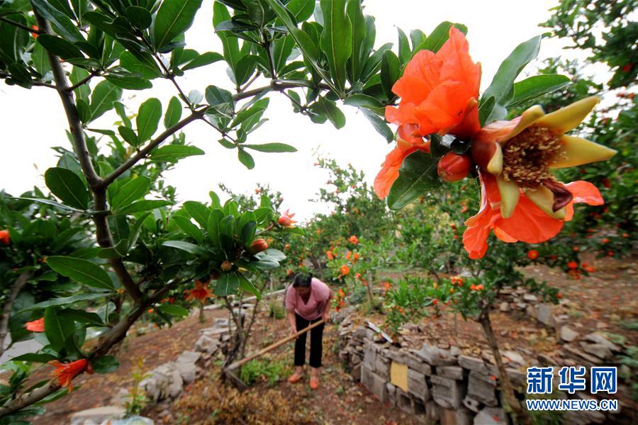 5月26日,在山東省棗莊市嶧城石榴園,果農(nóng)在石榴樹下勞作。 新華社發(fā)(孫中喆 攝)