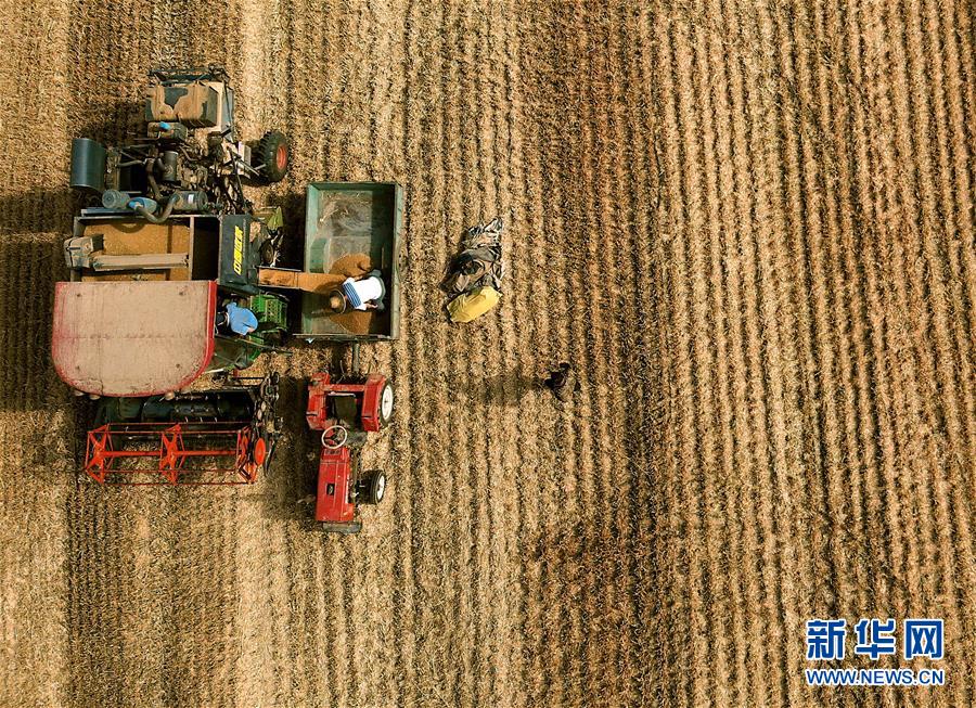 5月29日,在河南省舞陽縣保和鄉(xiāng)大路李村的一處麥田里,農機手操作機械收割小麥(無人機拍攝)。 眼下,“中原糧倉”河南迎來豐收季,各地小麥收割陸續(xù)開始。截至5月29日17時,全省已收獲小麥1598萬畝,約占種植面積的18.5%,機收率達到99%。 新華社記者 李安 攝