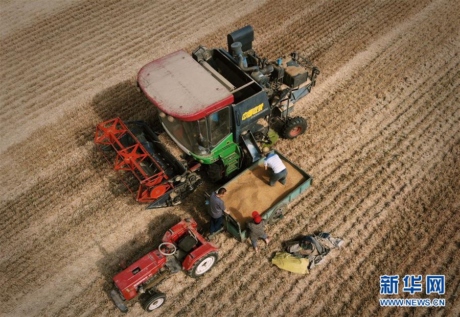 5月29日,在河南省舞陽縣文峰鄉(xiāng)焦樓村一處麥田里,農民將收獲的小麥裝車(無人機拍攝)。