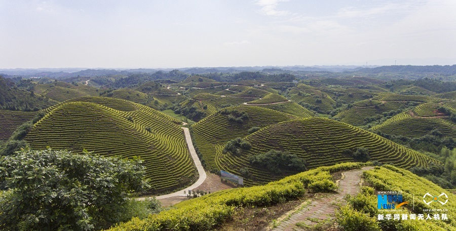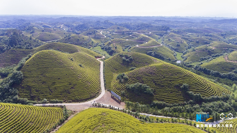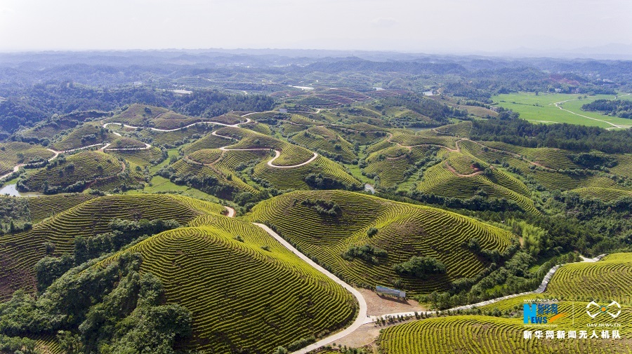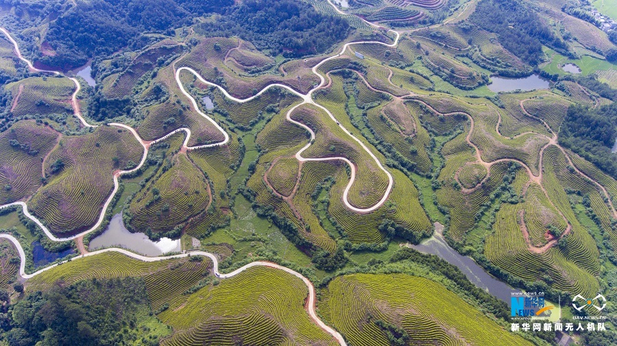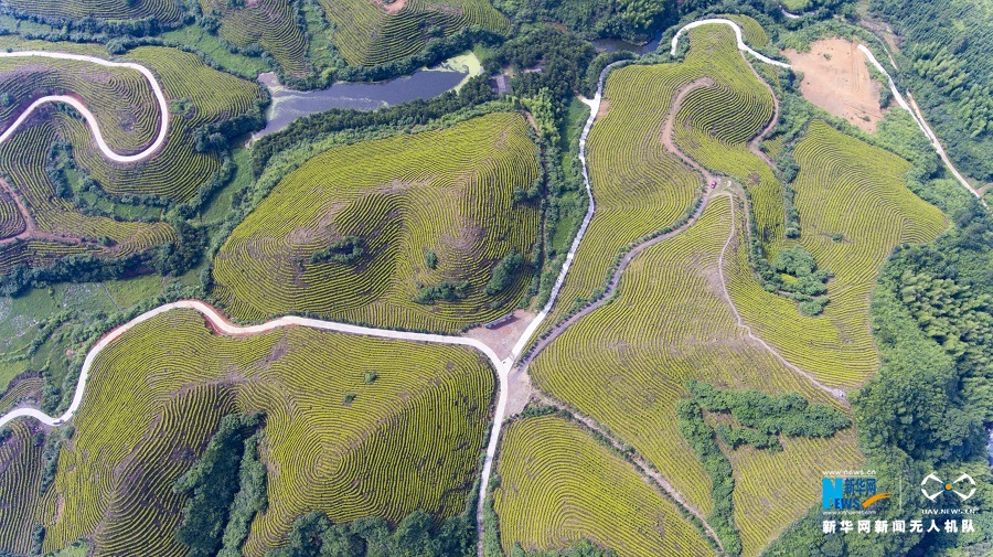 5月29日,從空中俯瞰江西省萬(wàn)安縣潞田鎮(zhèn)龍海黃金茶基地,5千多畝連綿不絕的茶園如大地指紋,美若畫卷。新華網(wǎng)發(fā) 邱哲 攝