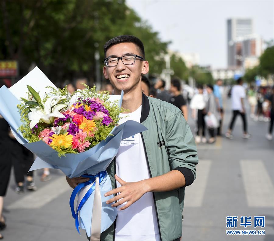 6月8日,在寧夏銀川市第二中學考點,一名走出考場的考生接受鮮花。 當日,全國部分地區(qū)2019年高考結(jié)束。 新華社發(fā)(馮開華 攝)