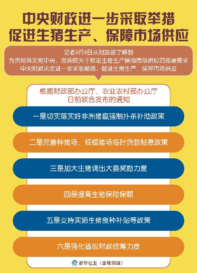 新華社北京9月4日電(記者申鋮)記者4日從財政部了解到,為貫徹落實黨中央、國務院關于穩(wěn)定生豬生產保障市場供應的部署要求,中央財政決定進一步采取措施,促進生豬生產、保障市場供應。