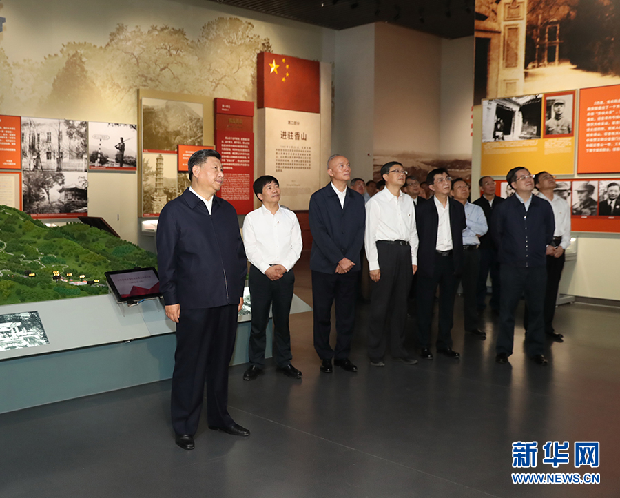 離開來青軒,習(xí)近平來到香山腳下的香山革命紀(jì)念館,參觀了《為新中國奠基——中共中央在北京香山》主題展覽。新建成的紀(jì)念館莊重大氣,“四梁八柱”的雨棚造型寓意黨中央在香山為新中國搭建四梁八柱。28根廊柱,象征中國共產(chǎn)黨從建黨到建立新中國28年的奮斗歷程。南廣場上矗立著高19.49米的國旗桿,寓意中華人民共和國誕生于1949年。主題展覽由“進(jìn)京‘趕考’”、“進(jìn)駐香山”、“繼續(xù)指揮解放全中國”、“新中國籌建”、“不忘初心、牢記使命、永遠(yuǎn)奮斗”5個(gè)部分組成,按歷史脈絡(luò),通過800多張圖片、報(bào)照、地圖、表格和1200多件實(shí)物、文獻(xiàn)和檔案,全景式生動(dòng)呈現(xiàn)中共中央在香山期間領(lǐng)導(dǎo)全國各族人民,完成民族獨(dú)立和人民解放的歷史使命、開啟中國歷史發(fā)展新紀(jì)元的光輝歷程。
