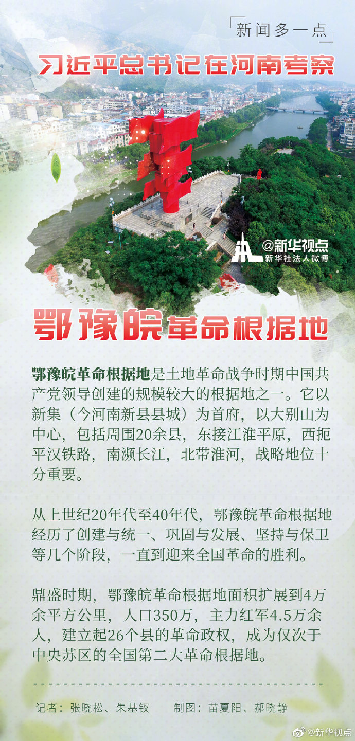 【學(xué)習(xí)進(jìn)行時(shí)】習(xí)近平總書記16日在河南省考察調(diào)研。當(dāng)天下午,他首先來(lái)到位于新縣的鄂豫皖蘇區(qū)首府烈士陵園,向革命烈士紀(jì)念碑敬獻(xiàn)花籃,瞻仰革命烈士紀(jì)念堂。隨后,他參觀了鄂豫皖蘇區(qū)首府革命博物館,并看望了當(dāng)?shù)丶t軍后代、烈士家屬代表。習(xí)近平總書記一直牽掛著大別山革命老區(qū)。新華社《學(xué)習(xí)進(jìn)行時(shí)》原創(chuàng)品牌欄目“講習(xí)所”今天推出文章,為您梳理解讀。