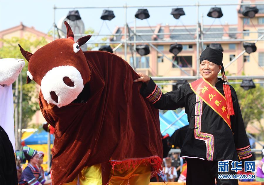 9月17日,廣西都安瑤族自治縣密洛陀文化公園廣場(chǎng),演員在啟動(dòng)儀式上表演節(jié)目《補(bǔ)糧添!贰