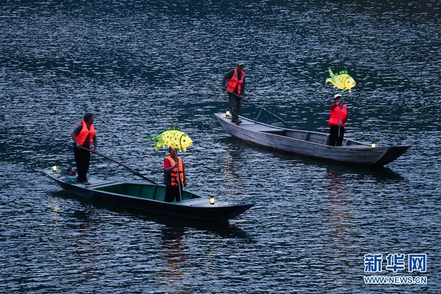 9月25日,在宋村鄉(xiāng)云源港的水面上,漁民劃著漁船,船頭點(diǎn)亮漁燈,構(gòu)成一幅“漁舟唱晚、萬(wàn)家燈火”的美麗圖景(無(wú)人機(jī)拍攝)。 近年來(lái),浙江省杭州市淳安縣宋村鄉(xiāng)積極發(fā)展鄉(xiāng)村旅游,打造漁家元素特色景觀,助力鄉(xiāng)村振興建設(shè)。目前,宋村鄉(xiāng)依托山水景觀和漁家文化,帶動(dòng)了當(dāng)?shù)鼐访袼藓图碁╂宜、自助燒烤、農(nóng)事體驗(yàn)、民俗攝影采風(fēng)為一體的特色旅游發(fā)展。2019年1月初至7月底,全鄉(xiāng)接待游客10萬(wàn)人次,實(shí)現(xiàn)旅游經(jīng)濟(jì)收入1300萬(wàn)元。 新華社記者 徐昱 攝
