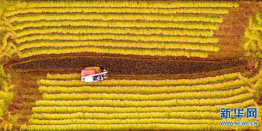 孟津縣銀灘大面積的水稻已經(jīng)成熟,收割機(jī)正在稻田作業(yè)。新華網(wǎng)發(fā)(高山岳 攝)