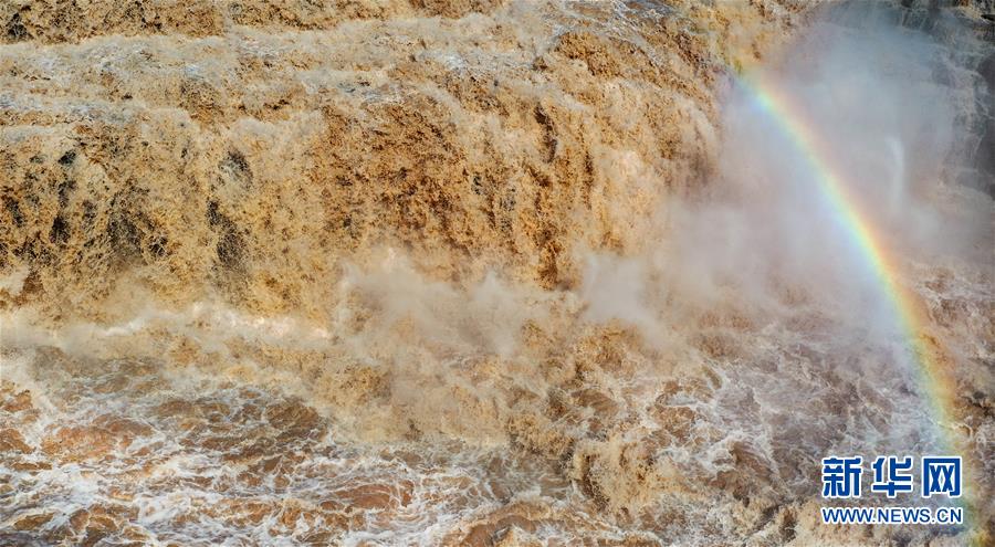 7月7日,黃河壺口瀑布主瀑上出現(xiàn)彩虹(無人機(jī)照片)。 近日,位于秦晉大峽谷的黃河壺口瀑布出現(xiàn)難得一見的“金色瀑布”景觀。
