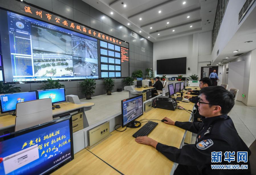 浙江省溫州市甌海區(qū)公安分局指揮中心內(nèi),警務(wù)人員在后臺實時監(jiān)控各類動態(tài)信息(2018年11月14日攝)。該局依托互聯(lián)網(wǎng)大數(shù)據(jù)等新手段,打造管理新模式,全面提升了警務(wù)效能。新華社記者 徐昱 攝