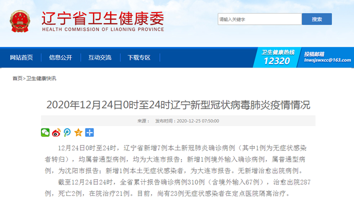 2020年12月24日0時至24時遼寧新型冠狀病毒肺炎疫情情況