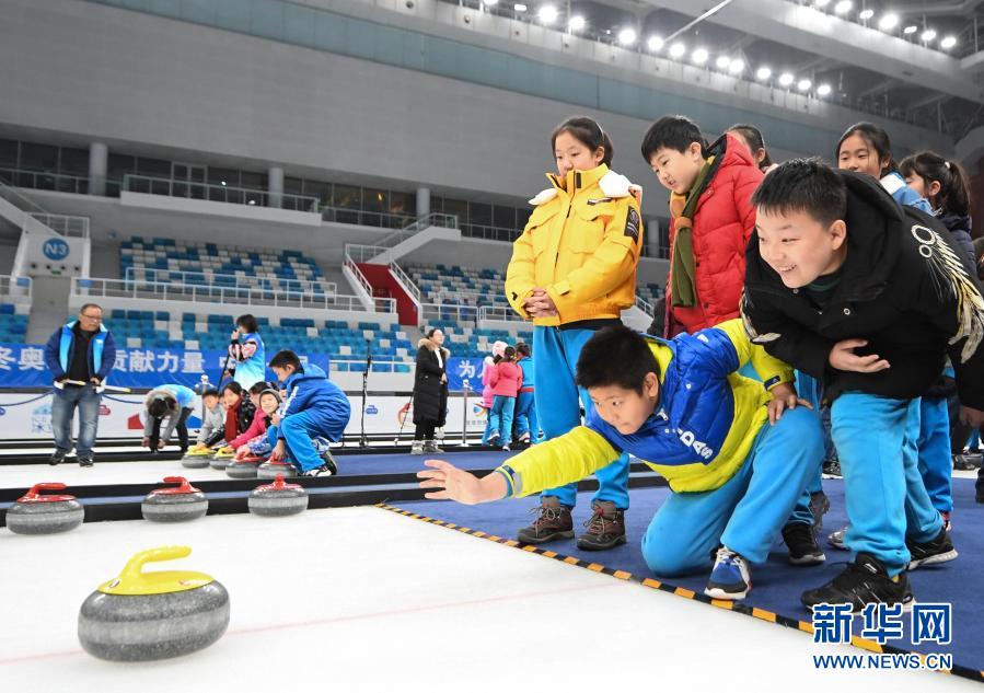 這是2019年12月10日,北京史家實(shí)驗(yàn)學(xué)校的學(xué)生在“冰立方”體驗(yàn)冰壺。新華社記者 鞠煥宗 攝