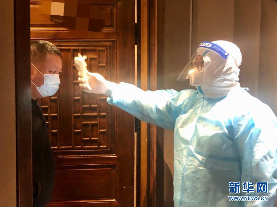 2月13日,黑龍江省哈爾濱市道外區(qū)巨源鎮(zhèn)衛(wèi)生院醫(yī)生王立夫在隔離點為隔離人員測溫。新華社發(fā)