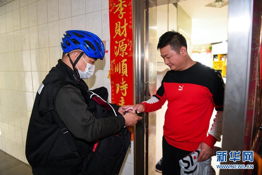在深圳福田區(qū)一小區(qū),順豐速運深圳區(qū)福星營業(yè)部收派員聶華辰(左)為客戶派送快件(2月10日攝)。新華社記者 毛思倩 攝