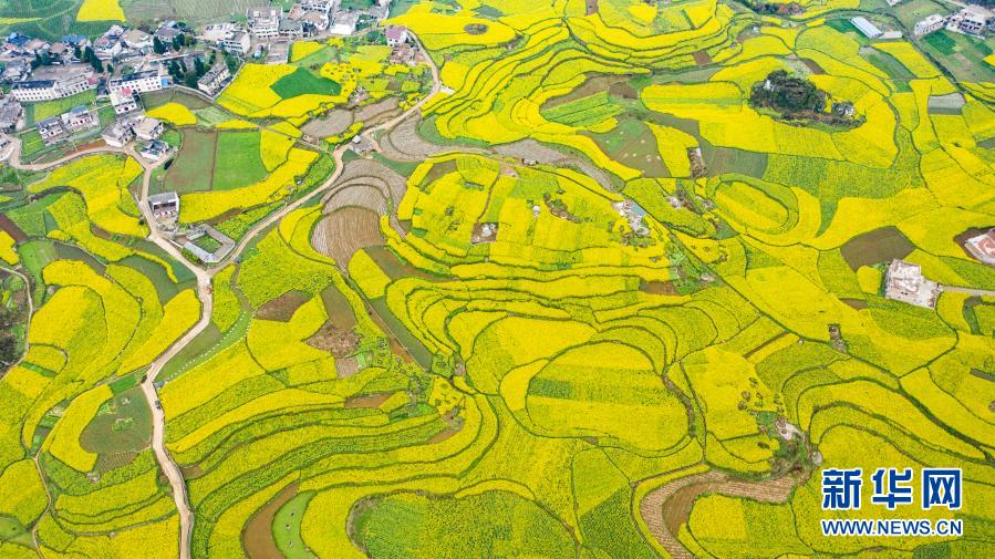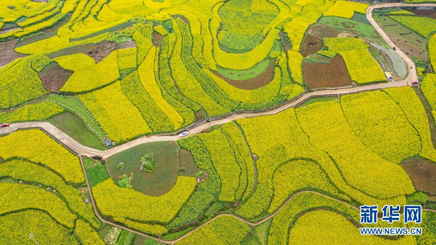 這是貴州省六盤水市六枝特區(qū)木崗鎮(zhèn)的油菜花田(3月5日攝,無人機(jī)照片)。
