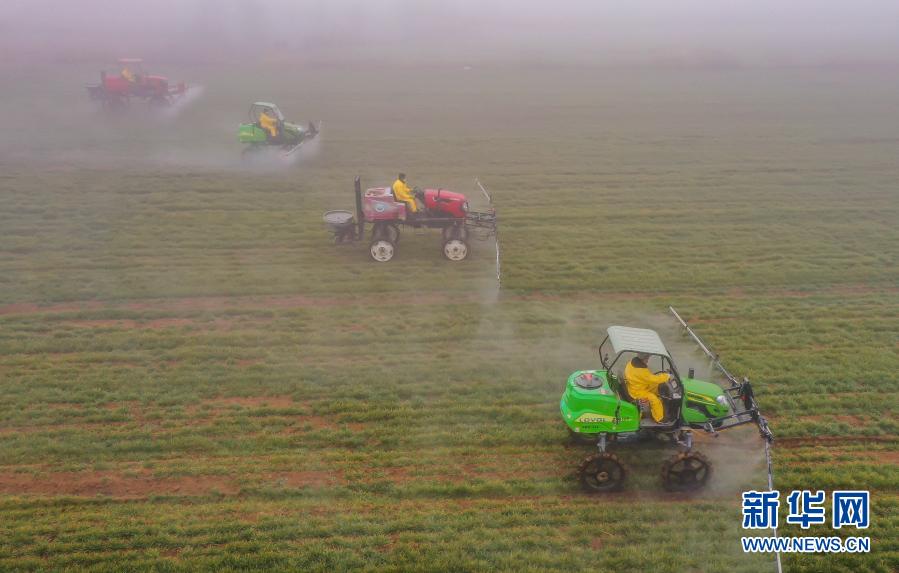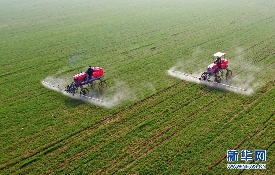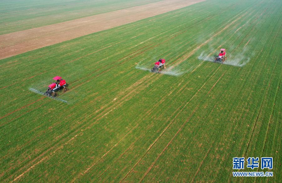 3月5日,河北省邢臺市南和區(qū)閻里鄉(xiāng)閻里村農(nóng)民操作農(nóng)業(yè)機(jī)械在麥田噴灑農(nóng)藥(無人機(jī)照片)。