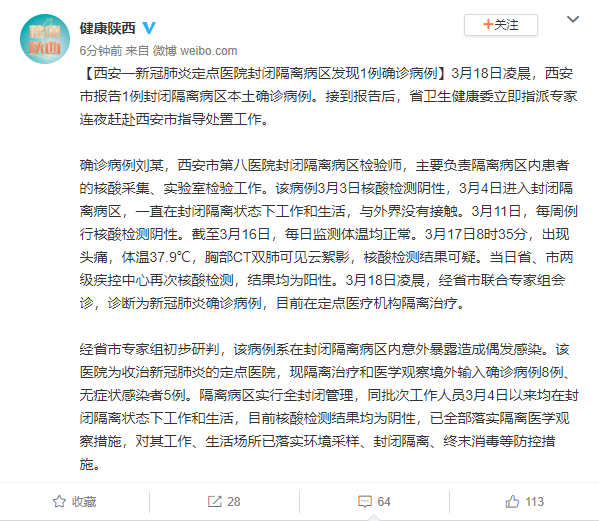 確診病例劉某,西安市第八醫(yī)院封閉隔離病區(qū)檢驗(yàn)師,主要負(fù)責(zé)隔離病區(qū)內(nèi)患者的核酸采集、實(shí)驗(yàn)室檢驗(yàn)工作。該病例3月3日核酸檢測(cè)陰性,3月4日進(jìn)入封閉隔離病區(qū),一直在封閉隔離狀態(tài)下工作和生活,與外界沒有接觸。3月11日,每周例行核酸檢測(cè)陰性。截至3月16日,每日監(jiān)測(cè)體溫均正常。3月17日8時(shí)35分,出現(xiàn)頭痛,體溫37.9℃,胸部CT雙肺可見云絮影,核酸檢測(cè)結(jié)果可疑。當(dāng)日省、市兩級(jí)疾控中心再次核酸檢測(cè),結(jié)果均為陽性。3月18日凌晨,經(jīng)省市聯(lián)合專家組會(huì)診,診斷為新冠肺炎確診病例,目前在定點(diǎn)醫(yī)療機(jī)構(gòu)隔離治療。