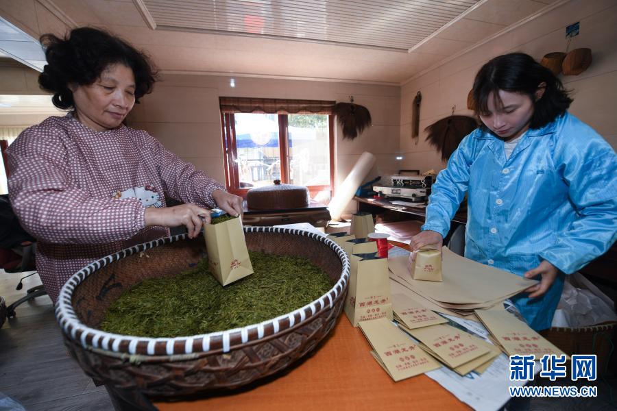 3月23日,杭州梅家塢村的茶農(nóng)在包裝炒制好的西湖龍井“明前茶”。新華社記者 徐昱 攝