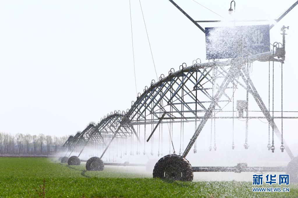 2021年2月23日,在河南省鶴壁市?h一片高標準農田里,自走式噴灌機在為小麥澆水。新華社記者 許雅楠 攝