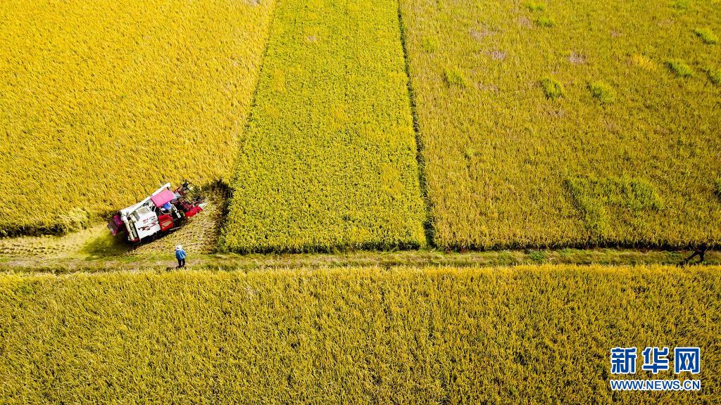 2020年10月21日,在山東省棗莊市臺兒莊區(qū)邳莊鎮(zhèn),收割機在收獲水稻(無人機照片)。新華社記者 郭緒雷 攝