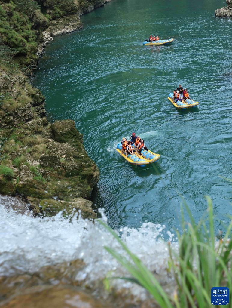 10月3日,游人在湖南省張家界市茅巖河風(fēng)景區(qū)體驗(yàn)水上漂流項(xiàng)目。新華社發(fā)(吳勇兵攝)