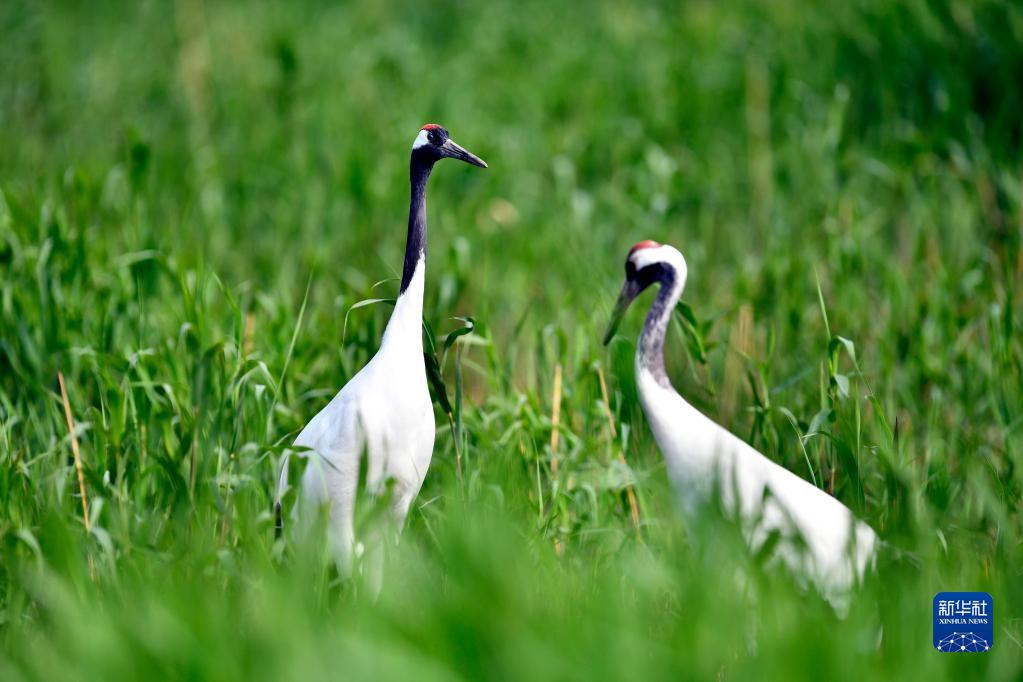 在山東黃河三角洲國家級(jí)自然保護(hù)區(qū),丹頂鶴在水草間棲息(2021年5月13日攝)。新華社記者 郭緒雷 攝