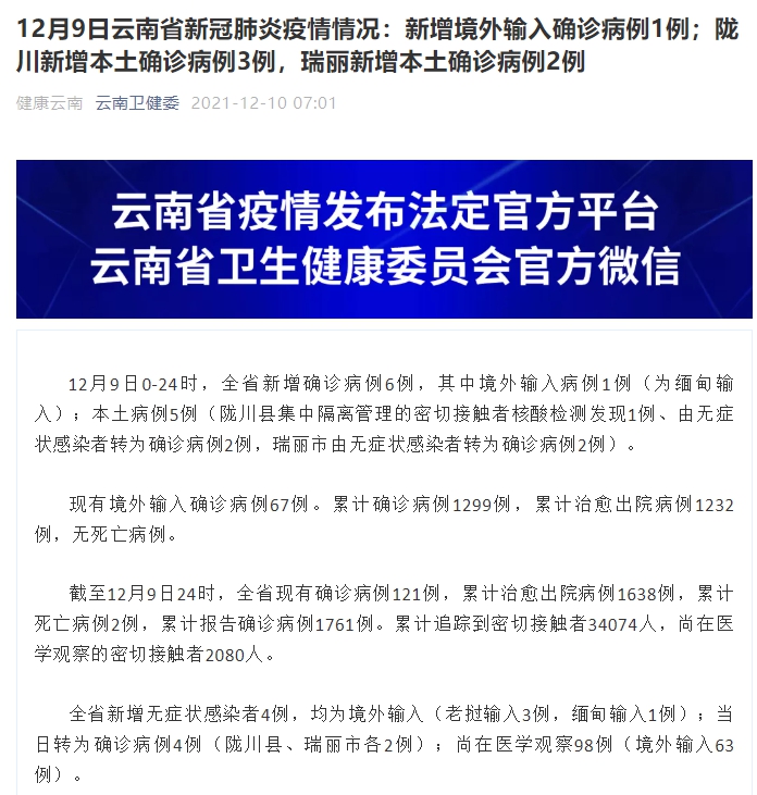 12月9日云南省新冠肺炎疫情情況:新增境外輸入確診病例1例;隴川新增本土確診病例3例,瑞麗新增本土確診病例2例
