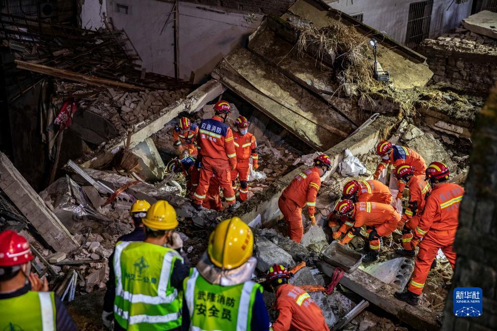 記者在現(xiàn)場(chǎng)看到,消防救援人員出動(dòng)多只搜救犬,在坍塌樓板的縫隙間搜尋被困人員,陸續(xù)有被困人員被救出。