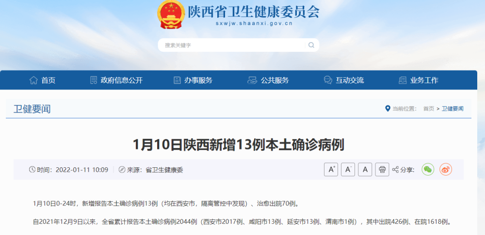 1月10日0-24時,新增報告本土確診病例13例(均在西安市,隔離管控中發(fā)現(xiàn))、治愈出院70例。