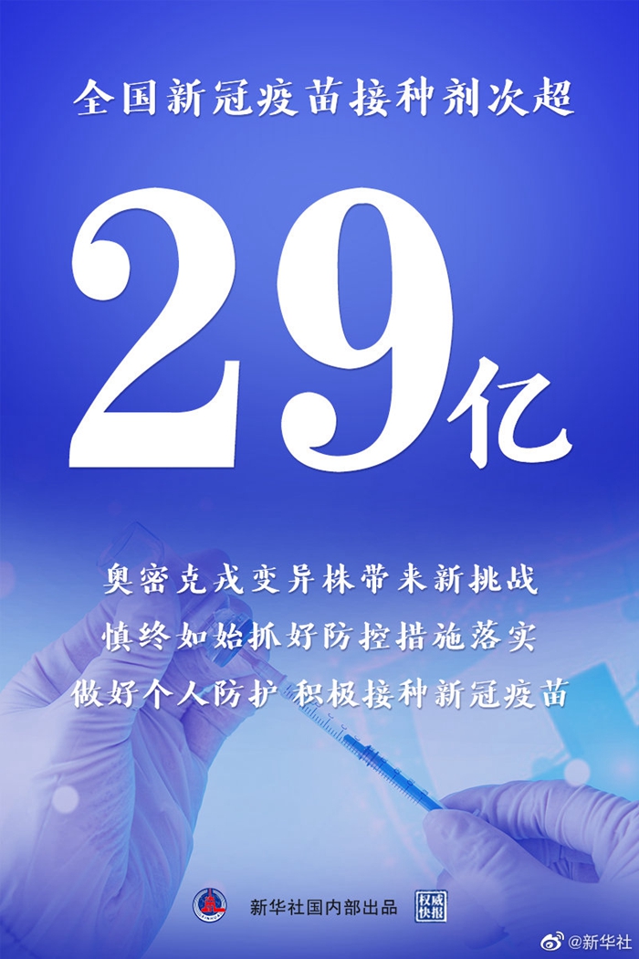 國家衛(wèi)健委11日通報,全國新冠疫苗接種劑次超29億。奧密克戎變異株帶來新挑戰(zhàn),國家衛(wèi)健委表示,要繼續(xù)堅持“外防輸入、內防反彈”總策略和“動態(tài)清零”總方針,不折不扣做到應檢盡檢、應隔盡隔、應治盡治。春節(jié)臨近,大家要提高疫情防控意識,遵守防疫要求,堅持做好個人防護,積極接種新冠疫苗。(記者徐鵬航、宋晨,海報設計喬昕)
