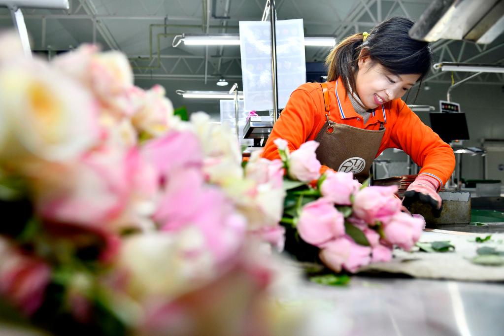 在莒縣招賢曲坊現(xiàn)代農(nóng)業(yè)產(chǎn)業(yè)園玫瑰基地,工作人員在包裝玫瑰。新華社記者 郭緒雷 2021年12月17日攝