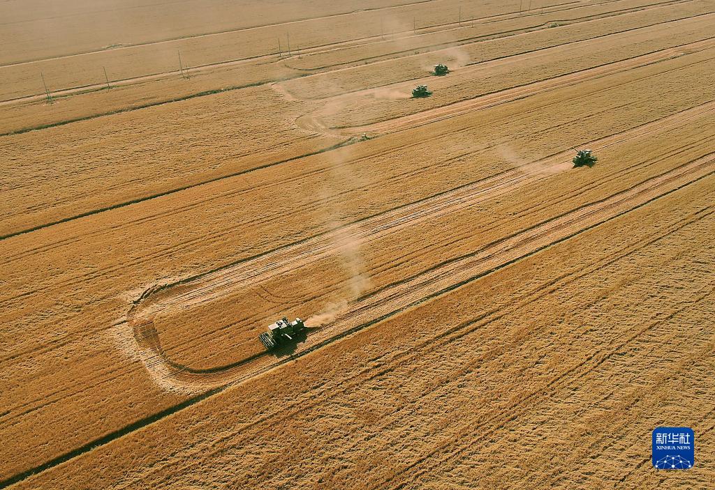 在河南省黃泛區(qū)農(nóng)場(chǎng)九分場(chǎng)的麥田里,農(nóng)機(jī)手操作收割機(jī)收獲小麥(2021年6月6日攝,無(wú)人機(jī)照片)。新華社記者 李安 攝