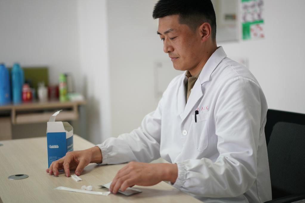 3月15日,東南大學(xué)附屬中大醫(yī)院醫(yī)學(xué)檢驗(yàn)科主任助理張臣正在演示抗原檢測(cè)的方法。(新華社記者季春鵬 攝)