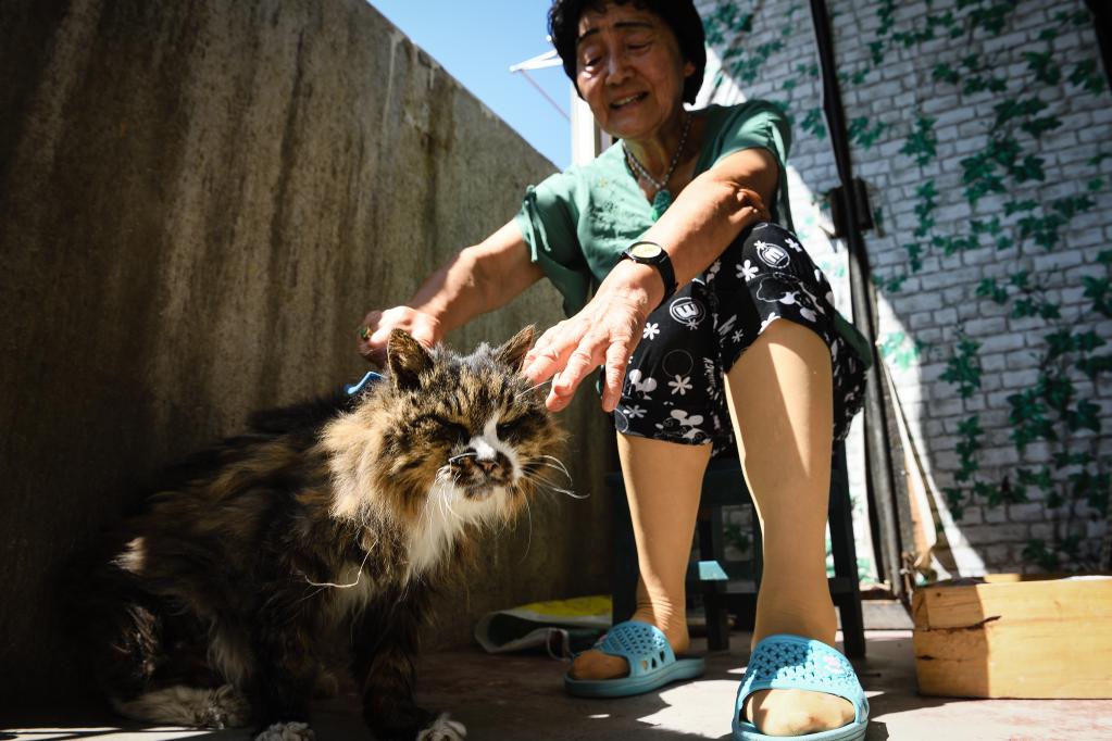 2017年9月14日,南京大屠殺幸存者王素明在南京家中陽(yáng)臺(tái)上為貓梳理毛發(fā)。新華社記者李響攝