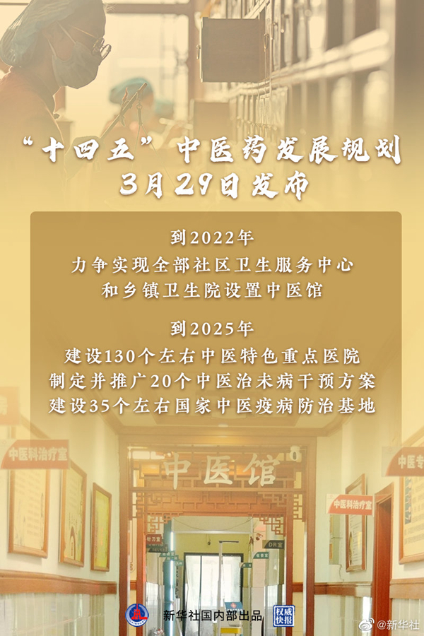 新華社北京3月29日電 國(guó)務(wù)院辦公廳日前印發(fā)《“十四五”中醫(yī)藥發(fā)展規(guī)劃》(以下簡(jiǎn)稱《規(guī)劃》),對(duì)“十四五”時(shí)期中醫(yī)藥工作進(jìn)行全面部署。