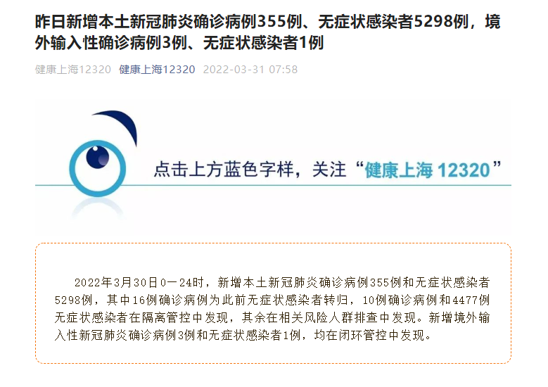 2022年3月30日0—24時,上海新增本土新冠肺炎確診病例355例和無癥狀感染者5298例,其中16例確診病例為此前無癥狀感染者轉(zhuǎn)歸,10例確診病例和4477例無癥狀感染者在隔離管控中發(fā)現(xiàn),其余在相關(guān)風(fēng)險人群排查中發(fā)現(xiàn)。新增境外輸入性新冠肺炎確診病例3例和無癥狀感染者1例,均在閉環(huán)管控中發(fā)現(xiàn)。