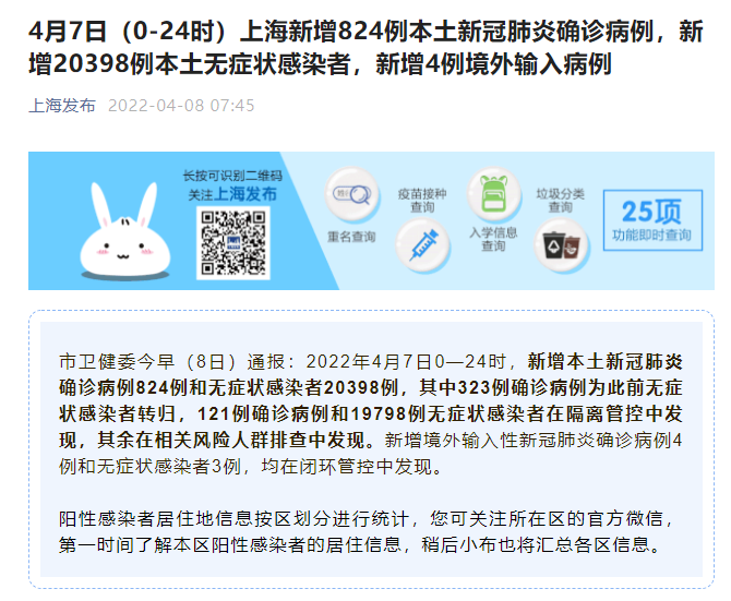 市衛(wèi)健委今早(8日)通報(bào):2022年4月7日0—24時(shí),新增本土新冠肺炎確診病例824例和無癥狀感染者20398例,其中323例確診病例為此前無癥狀感染者轉(zhuǎn)歸,121例確診病例和19798例無癥狀感染者在隔離管控中發(fā)現(xiàn),其余在相關(guān)風(fēng)險(xiǎn)人群排查中發(fā)現(xiàn)。新增境外輸入性新冠肺炎確診病例4例和無癥狀感染者3例,均在閉環(huán)管控中發(fā)現(xiàn)。