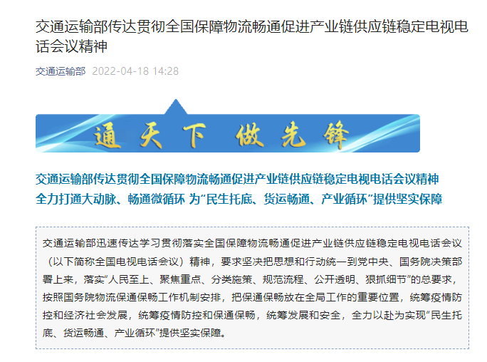 交通運輸部傳達貫徹全國保障物流暢通促進產(chǎn)業(yè)鏈供應鏈穩(wěn)定電視電話會議精神