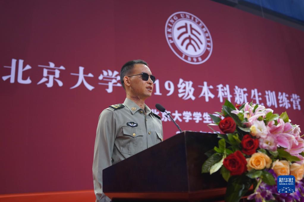 “排雷英雄戰(zhàn)士”杜富國在北京大學(xué)作先進(jìn)事跡報(bào)告(2019年9月3日攝)。新華社記者 李清華 攝