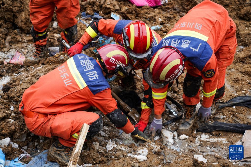 6月4日,消防救援人員在樂山市金口河區(qū)永勝鄉(xiāng)鹿兒坪石板溝發(fā)生高位山體垮塌現(xiàn)場清理檢查。新華社發(fā)(金口河區(qū)融媒體中心供圖)