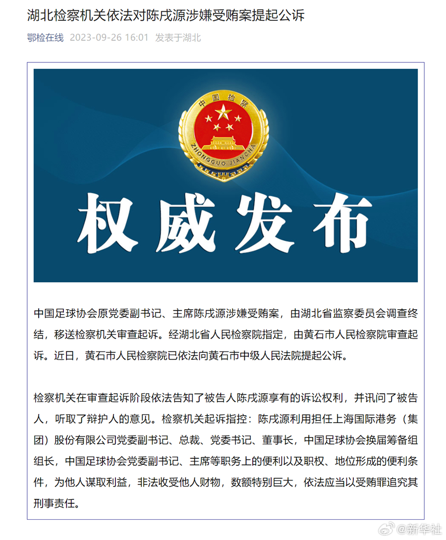 記者26日從湖北省人民檢察院獲悉,中國足球協(xié)會原黨委副書記、主席陳戌源涉嫌受賄案,由湖北省監(jiān)察委員會調(diào)查終結(jié),移送檢察機(jī)關(guān)審查起訴。經(jīng)湖北省人民檢察院指定,由黃石市人民檢察院審查起訴。近日,黃石市人民檢察院已依法向黃石市中級人民法院提起公訴。