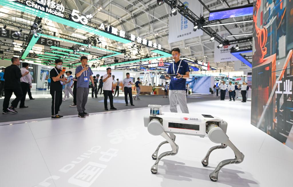 2024年6月20日,2024世界智能產(chǎn)業(yè)博覽會在國家會展中心(天津)開幕。圖為參展商在博覽會現(xiàn)場演示一款機(jī)器人。新華社記者 孫凡越 攝