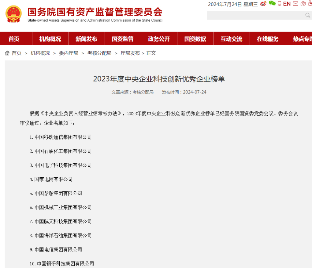 國務(wù)院國資委7月24日發(fā)布了2023年度中央企業(yè)科技創(chuàng)新優(yōu)秀企業(yè)榜單,中國移動(dòng)通信集團(tuán)有限公司、中國石油化工集團(tuán)有限公司、中國電子科技集團(tuán)有限公司等26家中央企業(yè)上榜。這是國務(wù)院國資委首次設(shè)立年度科技創(chuàng)新優(yōu)秀企業(yè)榜單。
