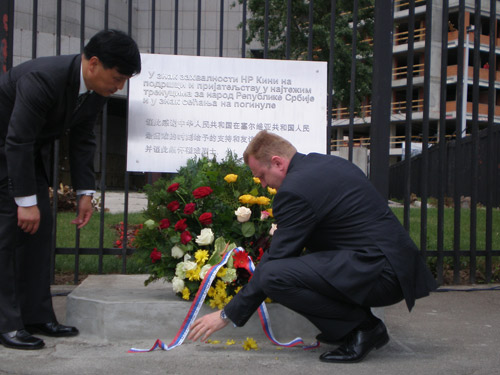 5月7日,中國(guó)駐塞爾維亞大使魏敬華和貝爾格萊德市長(zhǎng)吉拉斯為紀(jì)念牌揭幕、獻(xiàn)花。金曉蕾攝 |