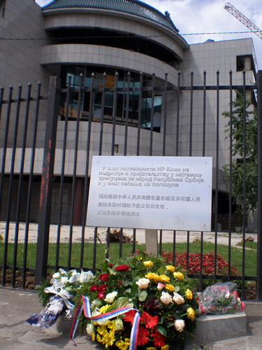 紀(jì)念牌上用塞語(yǔ)和漢語(yǔ)刻著:“謹(jǐn)此感謝中華人民共和國(guó)在塞爾維亞共和國(guó)人民最困難的時(shí)刻給于的支持和友誼,并謹(jǐn)以此緬懷罹難烈士。”金曉蕾拍攝 |