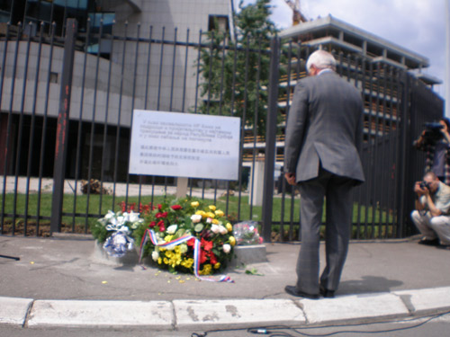 本報(bào)駐塞爾維亞特約記者 金曉蕾 每年5月7日前后,在中國(guó)被炸使館前總能見(jiàn)到中國(guó)駐塞使館全體工作人員、當(dāng)?shù)厝A人團(tuán)體、塞爾維亞民間團(tuán)體和個(gè)人敬獻(xiàn)的花圈花環(huán)。今年的的活動(dòng)氣氛更加凝重。5月7日中午,在被炸使館前,上百人人參加了立紀(jì)念牌的悼念活動(dòng)。中國(guó)駐塞爾維亞大使魏敬華和貝爾格萊德市長(zhǎng)吉拉斯為紀(jì)念牌揭幕、獻(xiàn)花。紀(jì)念牌上用塞語(yǔ)和漢語(yǔ)刻著:“謹(jǐn)此感謝中華人民共和國(guó)在塞爾維亞共和國(guó)人民最困難的時(shí)刻給于的支持和友誼,并謹(jǐn)以此緬懷罹難烈士。 ”吉拉斯市長(zhǎng)表示,感謝中國(guó)人民,并珍惜兩國(guó)人民在患難中建立的友誼。他還強(qiáng)調(diào),應(yīng)該繼續(xù)致力與發(fā)展這種友好關(guān)系。魏敬華大使在致辭中也表示:患難見(jiàn)真情。參加活動(dòng)的一位市政府官員說(shuō):“被美國(guó)操縱的國(guó)際社會(huì)沒(méi)有對(duì)炸觀事件作出應(yīng)有反應(yīng),也沒(méi)有對(duì)事件進(jìn)行深入調(diào)查!