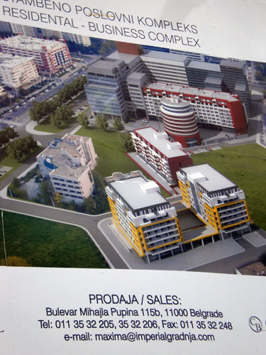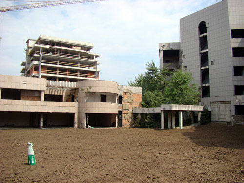 在采訪時(shí)正巧碰上貝市園林管理處的工人們?cè)谇鍜咧苓叺睦,在?chǎng)院里進(jìn)行綠化,草籽也已經(jīng)種上。而使館周圍則吊車林立,整個(gè)兒變成一個(gè)大建筑工地。規(guī)劃公告牌展示著這個(gè)新貝爾格萊德地皮最貴的小區(qū)將會(huì)被建成高級(jí)商務(wù)住宅區(qū),公告牌下方則是醒目的兩個(gè)大字:“出售”。