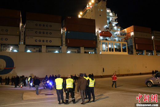 當?shù)貢r間2月28日夜,中國遠洋運輸集團6.9萬噸級的遠洋集裝箱貨輪“天福河號”接運559名在利比亞的中國公民抵達希臘克里特島伊拉克里翁港碼頭。這是中國大型貨輪首次接運在利比亞的中國公民抵達希臘。中新社發(fā) 吳衛(wèi)中 攝