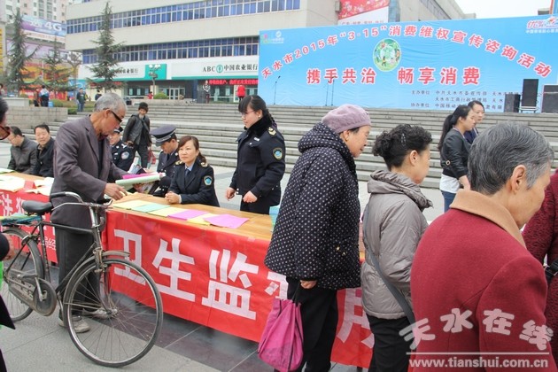 3月15日上午市龍城廣場人潮涌動,由市委宣傳部、市精神文明辦、市工商局、市消費者協(xié)會共同主辦的“攜手共治,暢享消費”天水市2015年“3.15”消費維權(quán)大型宣傳咨詢活動在這里隆重舉行。全市近萬人群眾在此聚集,共同慶祝自己的節(jié)日,天水市衛(wèi)生監(jiān)督所組織衛(wèi)生監(jiān)督員參加了相關(guān)宣傳咨詢活動。就老百姓關(guān)心的打擊非法行醫(yī)、生活飲用水衛(wèi)生監(jiān)督、公共場所衛(wèi)生安全、職業(yè)病防治、學(xué)校衛(wèi)生等方面進行了現(xiàn)場和咨詢。