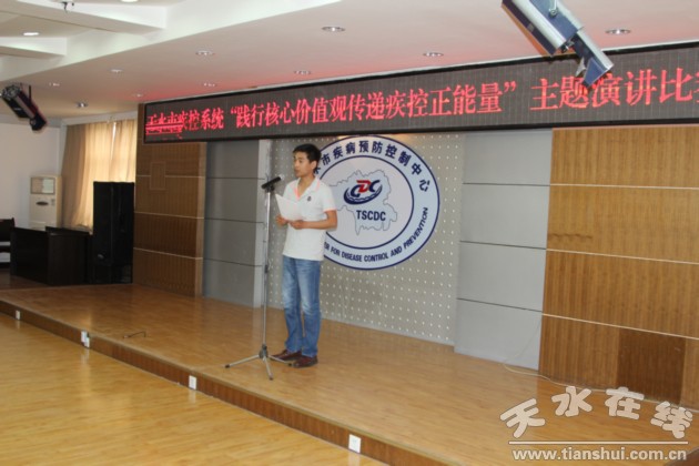為深入貫徹落實(shí)黨的十八大和十八屆四中全會精神,積極培育和踐行社會主義核心價(jià)值觀,深入學(xué)習(xí)、廣泛宣傳疾控系統(tǒng)典型人物的先進(jìn)事跡,彰顯疾控精神,凝聚疾控正能量, 5月26日,天水市疾控系統(tǒng)在中心六樓會議室開展了以“踐行核心價(jià)值觀·傳遞疾控正能量”為主題的演講比賽。市疾控中心領(lǐng)導(dǎo)班子及部分職工和來自全市7個(gè)縣區(qū)疾控中心負(fù)責(zé)人到場助威。來自全市7個(gè)縣(區(qū))疾控機(jī)構(gòu)和市本級疾控中心的17位選手登臺競技。比賽為了體現(xiàn)公平公正,特地邀請了市文工團(tuán)、天水師院的專家擔(dān)任演講比賽的評委。